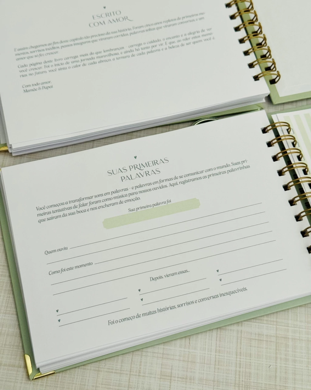 O livro do bebê é um álbum carinhoso feito para eternizar cada momento especial: desde a descoberta da gestação até os 5 aninhos do bebê, com espaço para fotos, mensagens e recordações que merecem ser eternizadas com amor.