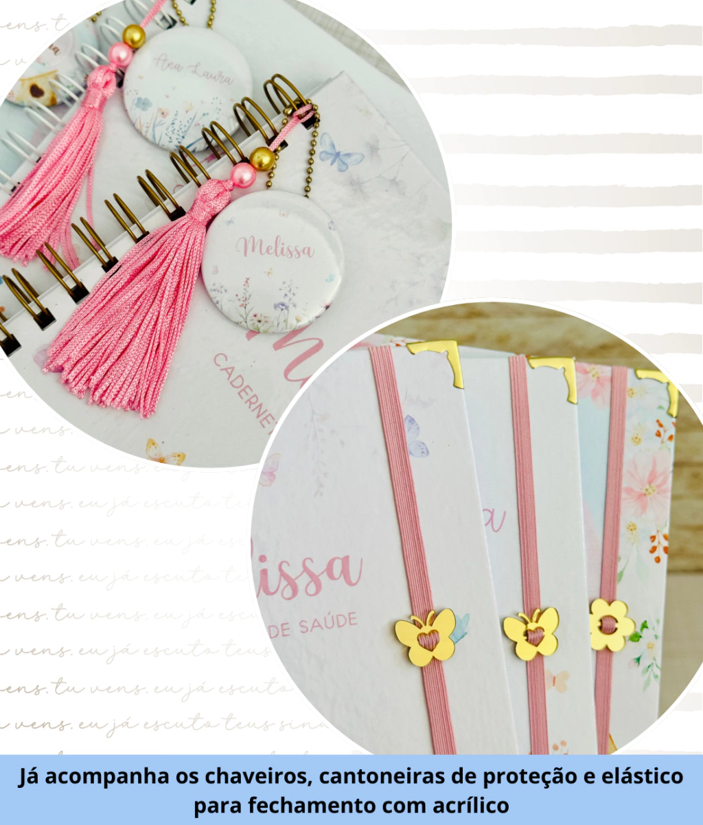 • Acompanha chaveiro botton personalizado com a mesma arte da capa, cantoneiras metálicas de proteção e chaveiro tassel com miçangas.